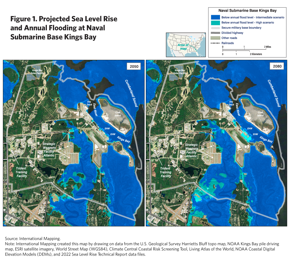 • Naval Submarine Base Kings Bay is vulnerable to rising sea levels and flooding that could significantly affect its capacity to service U.S. ballistic missile submarines (SSBNs). Because Kings Bay is one of two bases equipped to support the U.S. SSBN fleet, climate change effects there could have serious repercussions for the broader deterrence mission of the submarine leg of the nuclear triad.