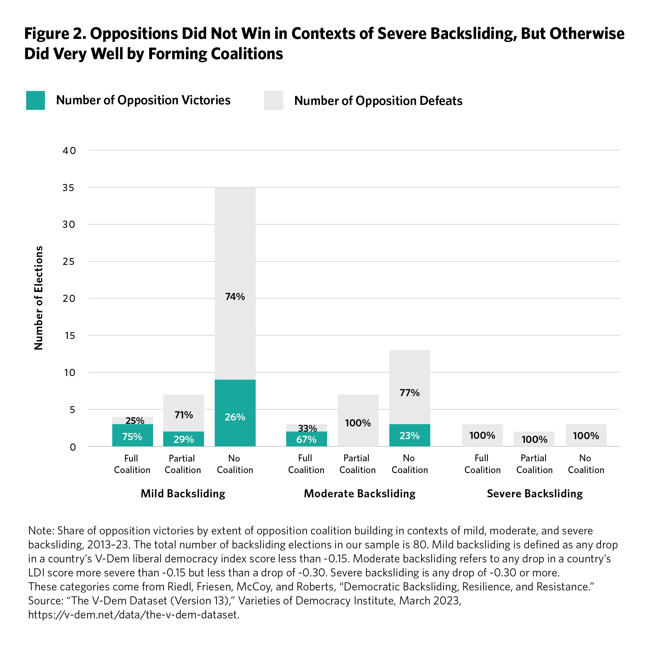 Figure 4 shows that in the past ten years, an opposition formed a full coalition in one-third of elections in countries with severe backsliding. In another third, an opposition formed a partial coalition (although as seen in Figure 1, none won). Meanwhile, among elections in countries with mild backsliding, only about one in ten oppositions formed a full coalition.