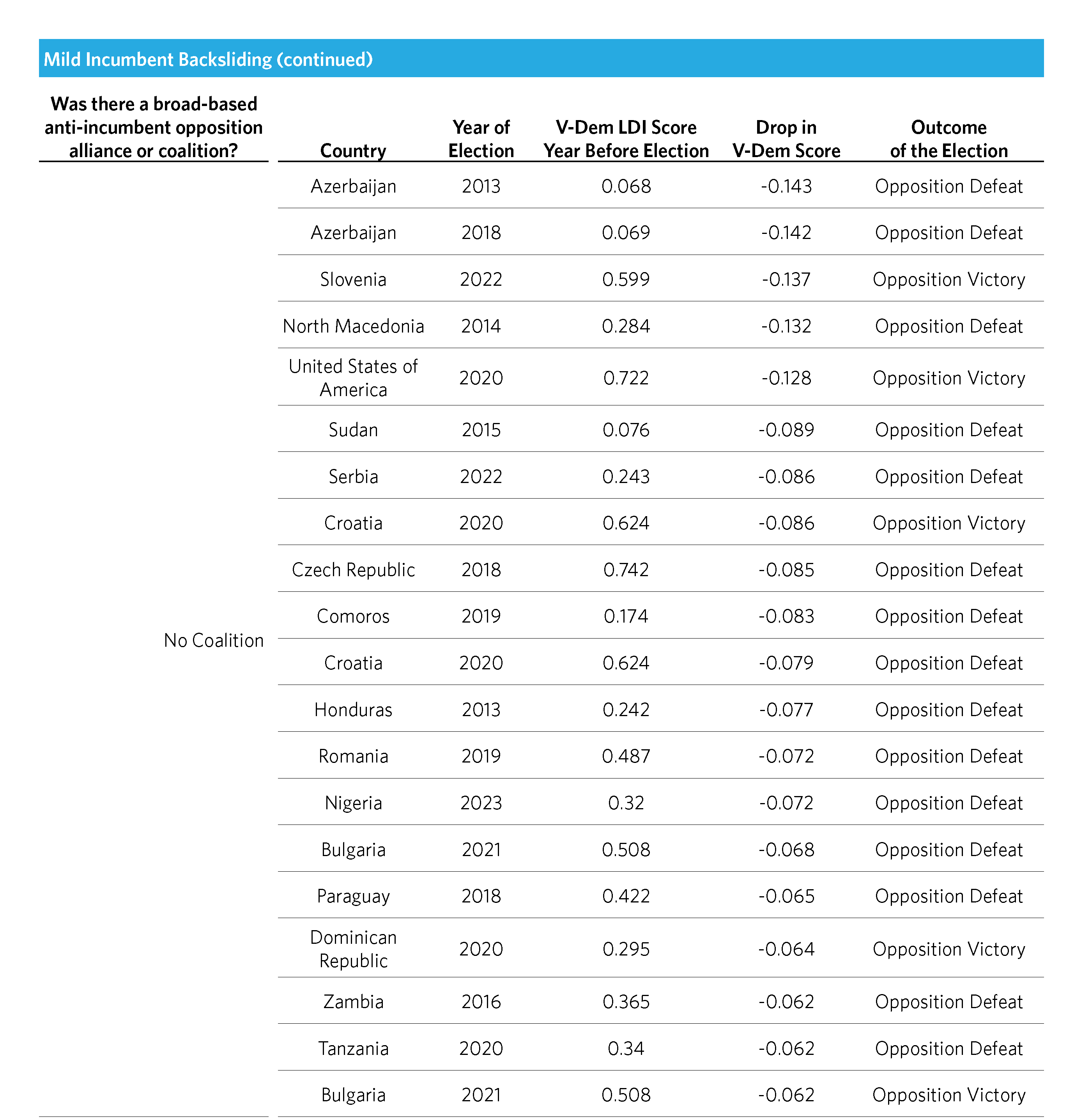The country with the lowest V-Dem LDI score whose opposition nonetheless ousted the backsliding incumbent was Gambia in 2016. Adama Barrow defeated Yahya Jammeh for the presidency. The V-Dem LDI score for Gambia in 2015 was just 0.10, yet Barrow still defeated Jammeh in the vote. Jammeh seemed poised to annul the election until a force from the Economic Community of West African States credibly threatened a military intervention, forcing him to flee the country. This election was an extraordinary case that demonstrates the role that external actors can play in ensuring that democratic elections, even in autocratic contexts, can lead to meaningful change.